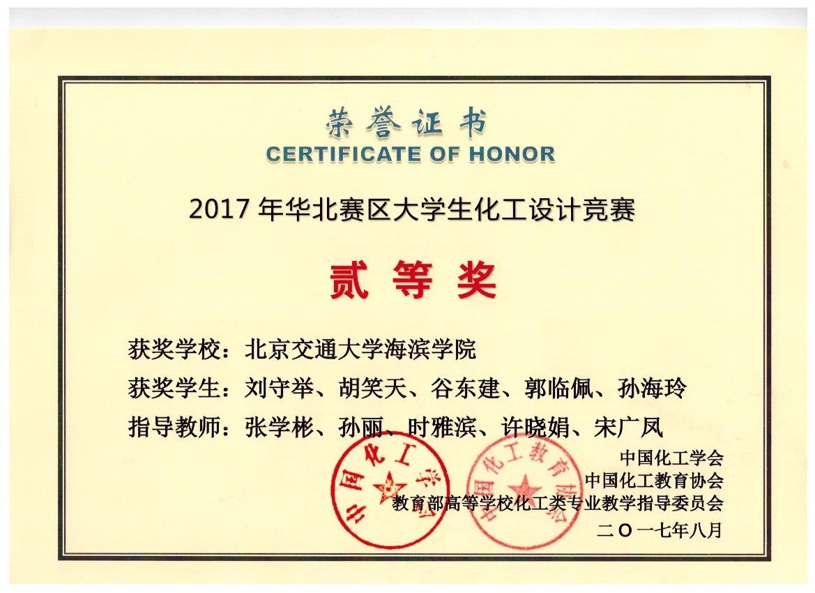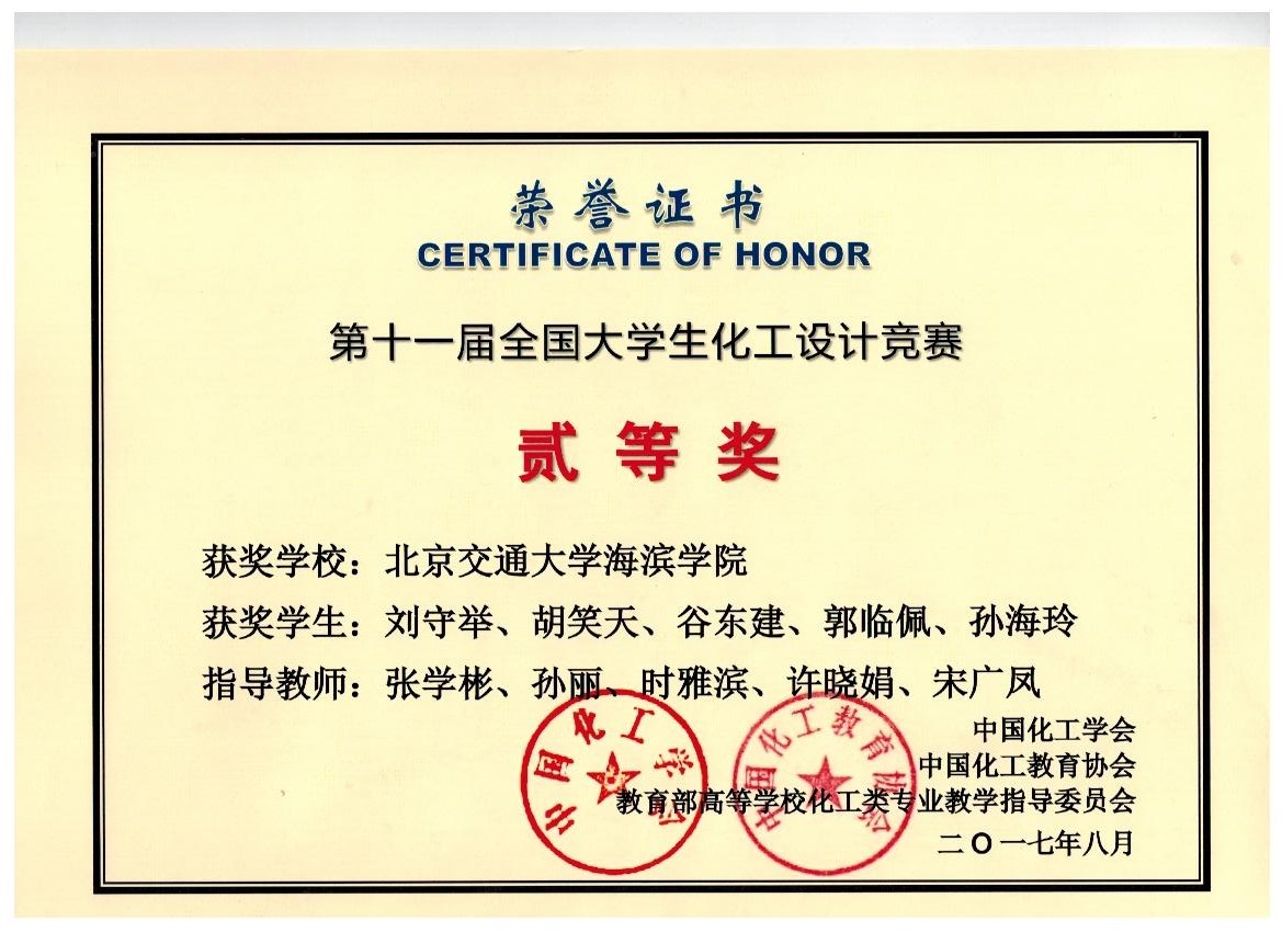 2017年8月3日-5日,由中国化工学会、中国化工教育协会、教育部高等学校化学工程与工艺专业教育指导分委员会联合主办,北京化工大学承办的2017年“东方仿真杯”第十一届全国大学生化工设计竞赛华北赛区竞赛在北京化工大学隆重举行。由sunbet官网化学工程系的张学彬、孙丽、时雅滨、许晓娟、宋广凤老师指导的团队(刘守举、胡笑天、谷东建、郭临佩、孙海玲)在华北赛区取得赛区二等奖,经不懈努力最终荣获全国化工设计大赛二等奖。与此同时,我院参加化工设计大赛的另外两支由贾婷、焦帅为队长带领的队伍同样获得了优异的成绩。