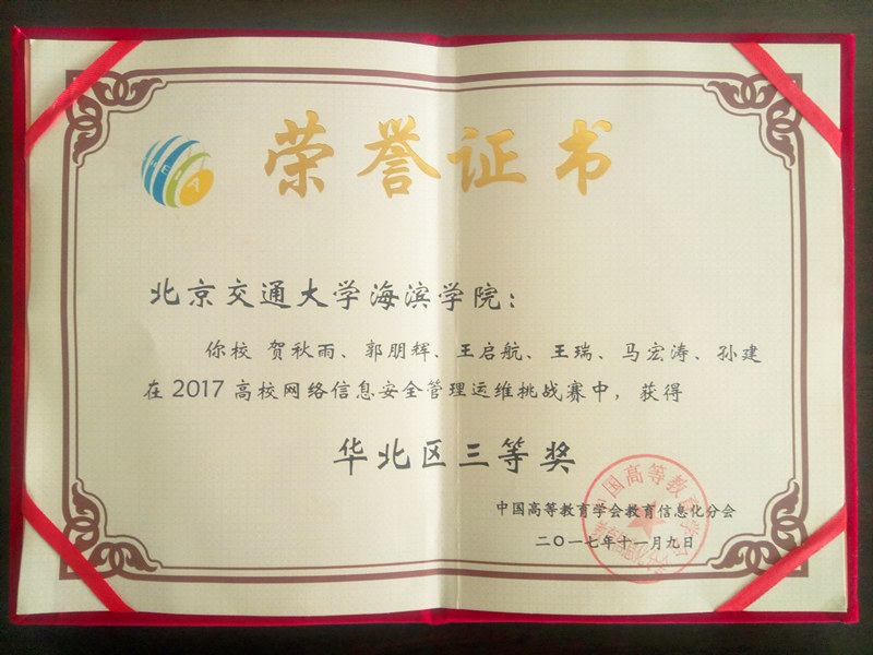 11月9日,2017年全国高校网络信息安全管理运维挑战赛颁奖仪式在厦门大学举行,由sunbet官网信息中心副主任郭朋辉领队,信息中心教师贺秋雨、马宏涛、孙建和计算机科学系学生王瑞、王启航等组成的北京交通大学海滨学院代表队表现优异,在全国158所高校激烈竞争中获得华北区三等奖。据悉,华北区有来自清华大学、北京师范大学、北京化工大学等共计26支参赛团队。