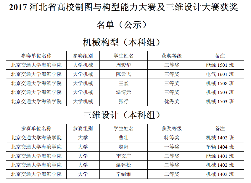 2017年5月20日,河北省制图与构型能力大赛及三维设计大赛在石家庄河北科技大学举办。sunbet官网机械与电气工程系10名同学在指导教师孙浩和刘栋老师的带领下,代表北京交通大学海滨学院首次参加了此次大赛,并取得优异成绩。其中,学生个人在制图与构型能力大赛中,获三等奖4项,优秀奖1项;在三维设计大赛中,获特等奖1项、一等奖1项、二等奖3项,同时,荣获三维设计大赛团体二等奖(第六名)。