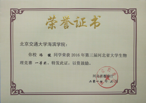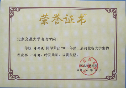 北京交通大学海滨学院第一次参加河北省大学生物理竞赛,考虑到2014级学生已经一年没有接触物理课程,学生报名积极性不高,大学物理教研室教员积极联系在2015年参加过北京市竞赛培训的所有同学,耐心鼓励,并在2016年7月份“小学期”期间精心选派青年教师成立赛前培训班,针对河北省大学生物理竞赛做知识点串讲和专题辅导,通过系统的辅导,使参赛选手具有更加扎实的物理基础知识和更加系统的物理思想,培养和锻炼了学生的自主学习能力和独立思考能力,极大提升了学生的自信心。通过参加此项赛事,有利于进一步提升我院在全省的知名度和影响力。