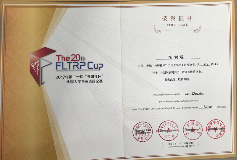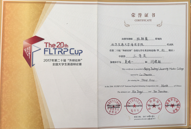 sunbet官网选派外语系英语专业陆朝霞老师为指导教师,宋琳琳为领队老师,经过层层遴选,英语专业2015级闫建超与夏婧一同学脱颖而出,代表sunbet官网参赛。经过两天的激烈赛事,sunbet官网两位辩手宏辞论道,舌战群儒,荣获大赛三等奖,为sunbet官网取得荣誉。