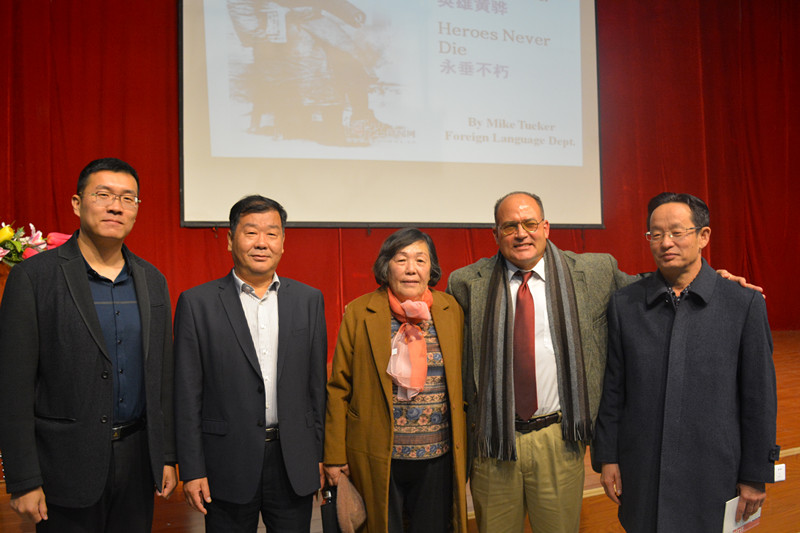 为展示烈士黄骅英雄事迹,弘扬黄骅精神,提高sunbet官网学生的英语听说能力,10月26日晚7点,sunbet官网美籍外教Michael Tucker在报告厅作了题为《黄骅英雄精神永存》的专题讲座。黄骅市常务副市长贾兆德,黄骅烈士女儿黄鲁彬,我院院长、党委书记王化深、党委副书记魏炜及相关职能处室负责人出席了讲座,全体外语系学生共同聆听讲座。讲座由党委副书记魏炜主持。