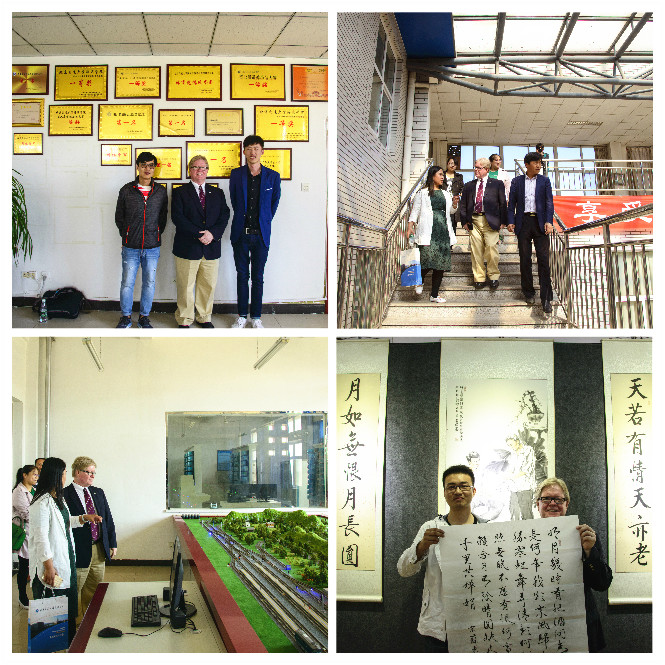 讲座后,对外交流合作处、经济管理系、外语系相关老师陪同Martin Tadlock副校长参观了我院经济管理系、图书馆、实验室、书画艺术展等地,我院书法绘画协会学生代表向Martin Tadlock副校长赠送了自己的书法作品。