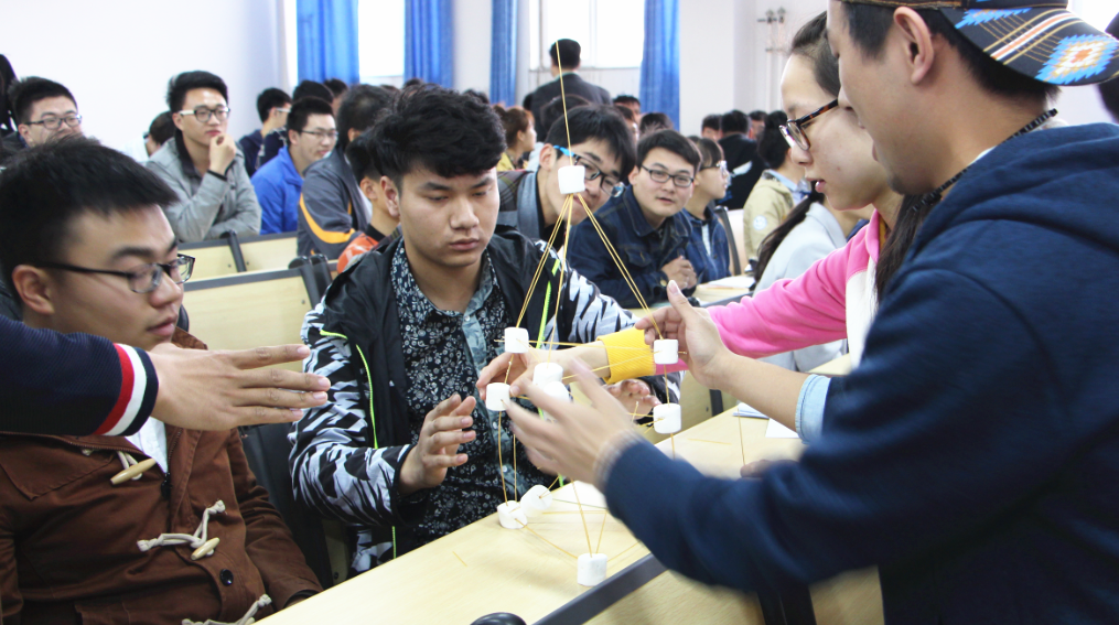 授课过程中,为了锻炼同学们的团体协作能力,老师现场组织了多种趣味游戏。例如现场分若干组在9分钟内比赛用棉花糖和意面“建塔”,并评选出最高最坚固的作品。同学们都快乐地融入到游戏中,在轻松的氛围中互帮互助,体验了动手操作和团队协作的乐趣。