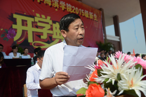薛行远董事长致辞,他表示祥兴集团将一如既往地为海滨学子成长创造良好的学习生活环境。他强调董事会将积极支持以王化深教授为首的新一届学院领导班子开展工作,为把学院建设成为跨越百年的名校而共同奋斗。