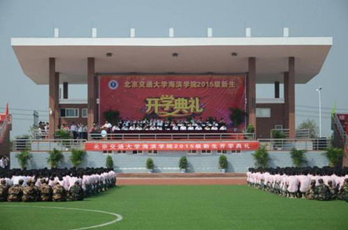 9月15日上午10点整,我院2015级新生开学典礼在学院体育场隆重举行。北京交通大学党委副书记高福廷,沧州市科技局局长龚金港、沧州市人力资源和社会保障局局长郭永志、沧州市教育局副局长刘建成,黄骅市人民政府市长朱春燕、副市长郑增强,祥兴集团总裁、学院董事长薛行远,副总裁张在兴、陈琼等集团代表和企业嘉宾广发银行石家庄分行副行长张建军等客人拨冗出席开学典礼。学院领导王化深、张长铎、张乐乐、薛爱兴、孙文博、徐爱国,各职能处室负责人、教学单位负责人和部门教师代表出席开学典礼。我院3160多名2015级新同学在辅导员老师的带领下整齐列队参加开学典礼。开学典礼由我院党委副书记孙文博主持。