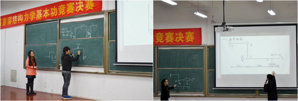晋级决赛的8名选手经过抽签分成四组。决赛分为“谁与争锋”和“奇思妙想”两个环节。在“谁与争锋”环节,四组选手任选一道结构力学绘图解答题进行现场讲解,并回答评委老师的提问。四组选手凭借扎实的基本功、默契的配合,在规定15分钟的时间内,成功解题。经过激烈角逐,4名选手成功进入第二环节。在“奇思妙想”环节,选手们要完成16道结构力学选择题,每题限时30秒,4名选手沉着冷静、思维敏捷、反应迅速,精彩的表现赢得在场评委和观众的阵阵掌声。
