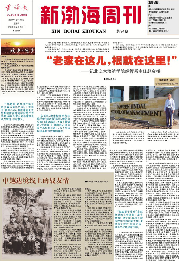 12月11日,黄骅报新渤海周刊头版首次推出《故乡·他乡》专栏,以“老家在这儿,根就在这里!”为题,对我院经济管理系主任赵金楼教授进行深入报道。