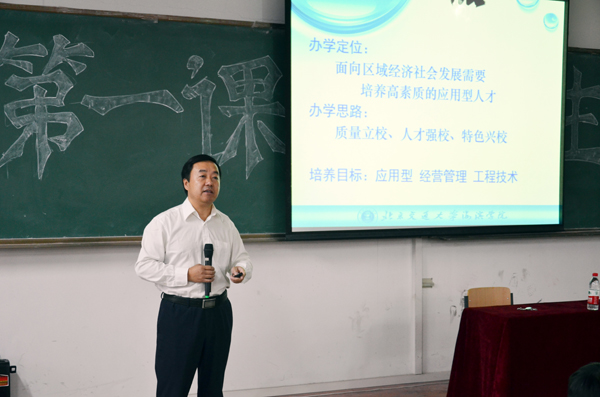 在开学第一课上,王院长以《我的大学·我的青春——你准备好了吗?》为题,从“这是一所怎样的大学”和“我的大学该怎样度过”两个层面进行讲解。在“这是一所怎样的大学”部分,王院长向同学们简要介绍了我院的综合办学情况,使同学们对学院基本情况有了更为全面的了解;在“我的大学该怎样度过”部分,王院长结合我院实际,与同学们共同探讨了大学的学习模式、学业与就业发展需求等问题,并为同学们规划未来四年的学习生活提出合理化建议,使同学们对自己的大学生活及未来发展有了更为清晰的认识。