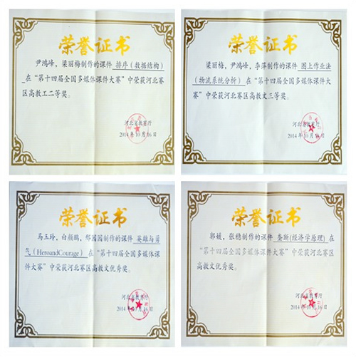 其中,尹鸿峰、梁丽梅制作的课件《排序(数据结构)》荣获河北赛区高教工科组二等奖,梁丽梅、尹鸿峰、李萍制作的课件《图上作业法(物流系统分析)》荣获河北赛区高教文科组三等奖。另有两个课件荣获河北赛区高教文科组优秀奖。