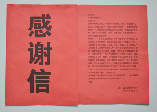 我院保卫处收到来自2014级新生家长的锦旗和感谢信