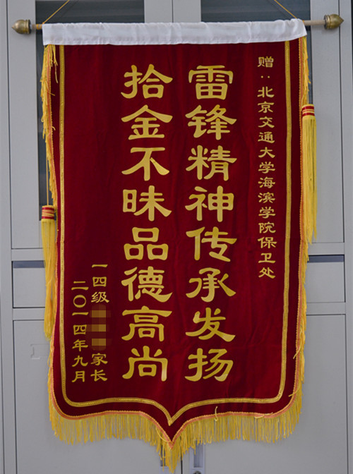 近日,我院保卫处收到来自2014级新生家长送来的写有“雷锋精神传承发扬,拾金不昧品德高尚”的锦旗和一封感谢信,高度赞扬了我院安保人员邓玉治拾金不昧、物归原主的高尚品德。