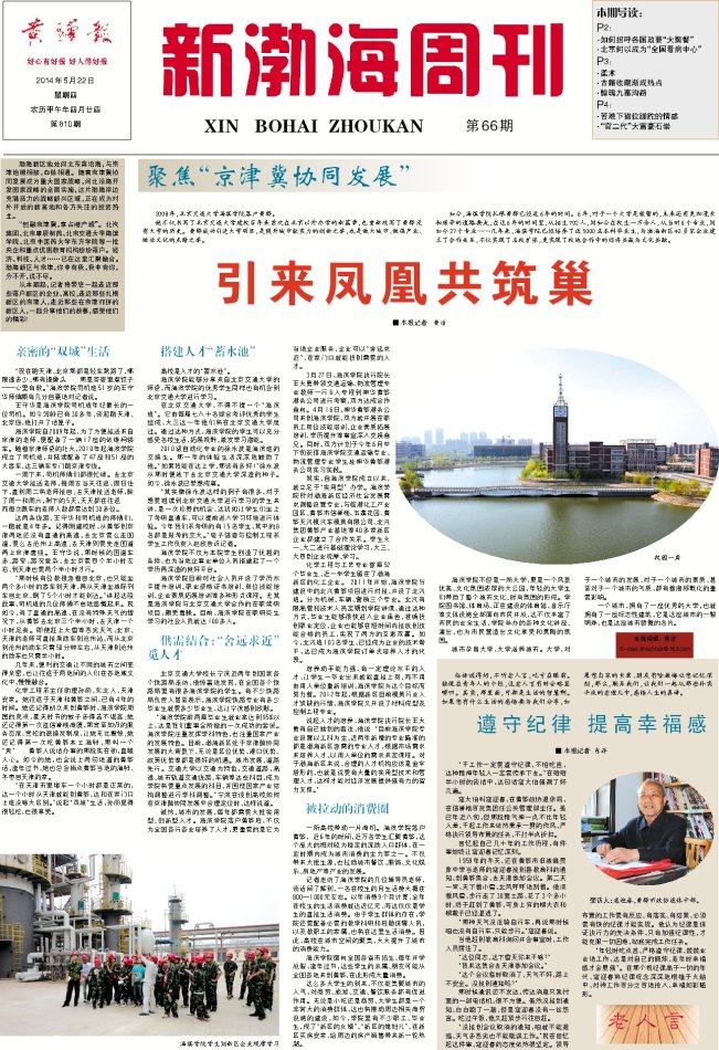 5月22日,黄骅报新渤海周刊头版头条刊发《引来凤凰共筑巢》,围绕“京津冀协同发展”这一话题,对建院六年来我院建设与发展情况进行深入细致的采访报道。