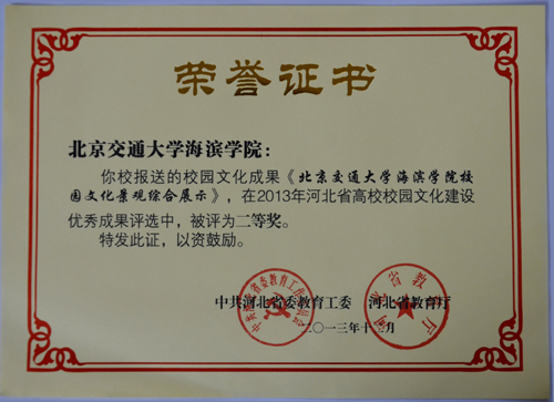 12月25日,中共河北省委教育工委,河北省教育厅公布2013年河北省高校校园文化建设优秀成果评选结果,我院申报的校园文化建设项目《北京交通大学海滨学院校园文化景观综合展示》荣获二等奖。