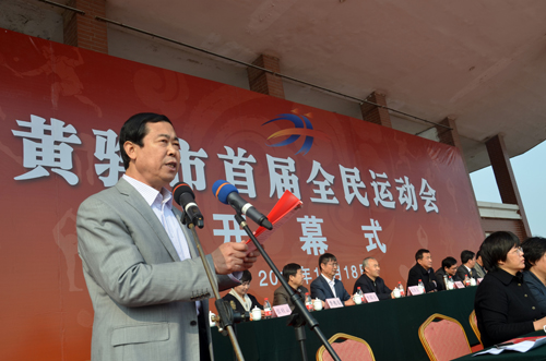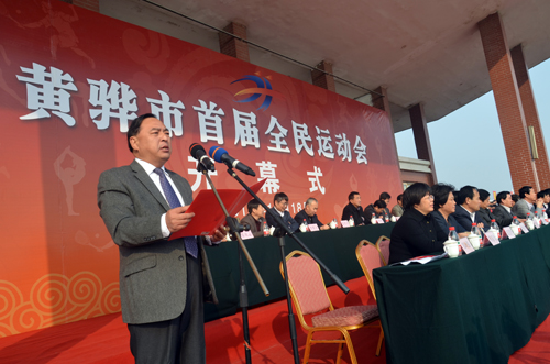 黄骅市委副书记董文昌致开幕词。他指出,黄骅市首届全民运动会的举办,不仅是我市体育发展史上的空前盛事,也是全市政治经济生活中的一大喜事,更是一次检阅“精气神”、聚集正能量的大会。他希望全市上下在更快、更高、更强的体育精神的激励下,进一步振奋精神、创新进取,向好的学、与强的比、跟快的赛,在城市建设、经济建设和城镇化建设“三大板块”中贡献力量,形成赶学比拼、群马拉车的生动局面,早日把黄骅建成靓丽、繁华、宜居、和谐的滨海新城。