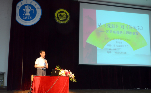 蔡海波教授主讲的题目是“从《亮剑》到《闯关东》——优秀电视剧主题歌鉴赏”。蔡教授通过对具有代表性的优秀电视剧主题歌的专业透析和梳理,引领我院师生走进美妙的音乐世界。蔡教授的讲座内容丰富、深入浅出、诙谐幽默,为广大师生呈现了一场高雅的音乐盛宴,赢得在场观众的阵阵掌声。