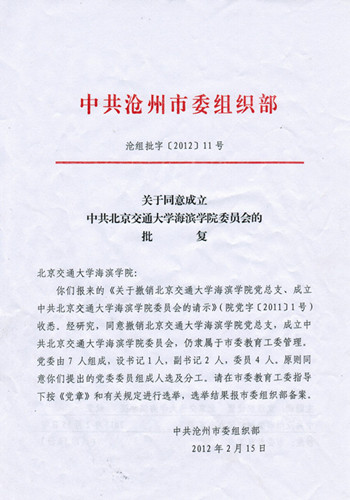 ■2月15日,经中共沧州市委组织部批准,同意撤销北京交通大学海滨学院党总支,成立中共北京交通大学海滨学院委员会,标志着我院党委正式成立。