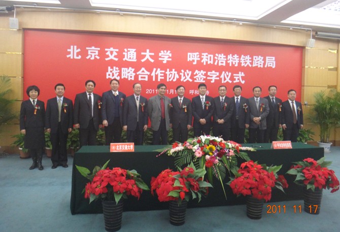 在签字仪式上,宁滨校长首先对呼和浩特铁路局多年来支持学校人才培养、科学研究、学科建设表示感谢。宁滨校长指出,北京交通大学与呼和浩特铁路局有着良好的合作基础,在铁路科学发展的大背景下,希望双方进一步加强合作,在人才培养、战略规划研究、重载运输技术进步等方面密切合作,为我国铁路事业、教育事业做出贡献。