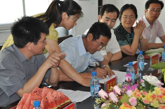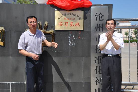 7月8日上午9时30分,我院与黄骅市第三中学建立实习实训基地的挂牌仪式在黄骅三中会议室召开。会上,我院副院长贾怀义与黄骅三中校长郑福同正式签订了合作协议。10时整,在一片热烈的掌声中,北京交通大学海滨学院外语教学实习基地正式揭牌成立。这是我院第一个正式挂牌建立的实习基地。我院副院长贾怀义、周俞波,教务处长刘燕,外语专业负责人张军学教授,黄骅教育局孔令岗副局长,黄骅三中校长郑福同以及三位副校长、办公室、教务处主任等出席了仪式。
