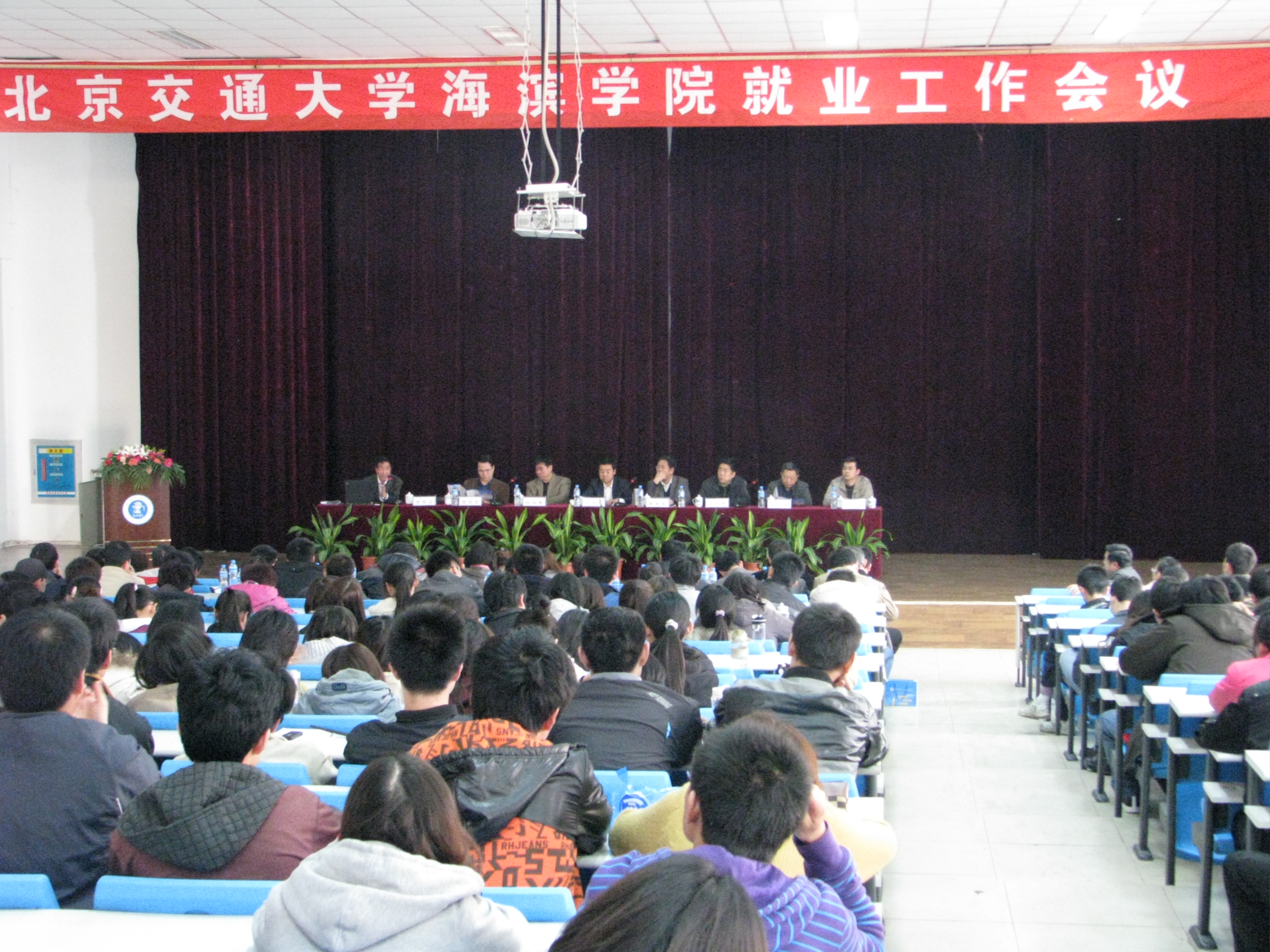 2011年3月26日下午,北京交通大学海滨学院2012届毕业生就业工作会议召开。河北省教育厅就业指导中心主任姬振旗、渤海新区管委会组织部长兼人社局局长叶永贺、天津人力资源开发服务中心高校毕业生服务部部长刘凤景、黄骅市人力资源市场管理办公室主任王军应邀出席大会并与我院领导王大勇、张长铎、贾怀义、吴子成在主席台就座。学院各专业负责人、各二级机构负责人和2008级全体同学、辅导员、班主任参加大会。渤海新区北方人力资源有限公司也派代表参加了大会。