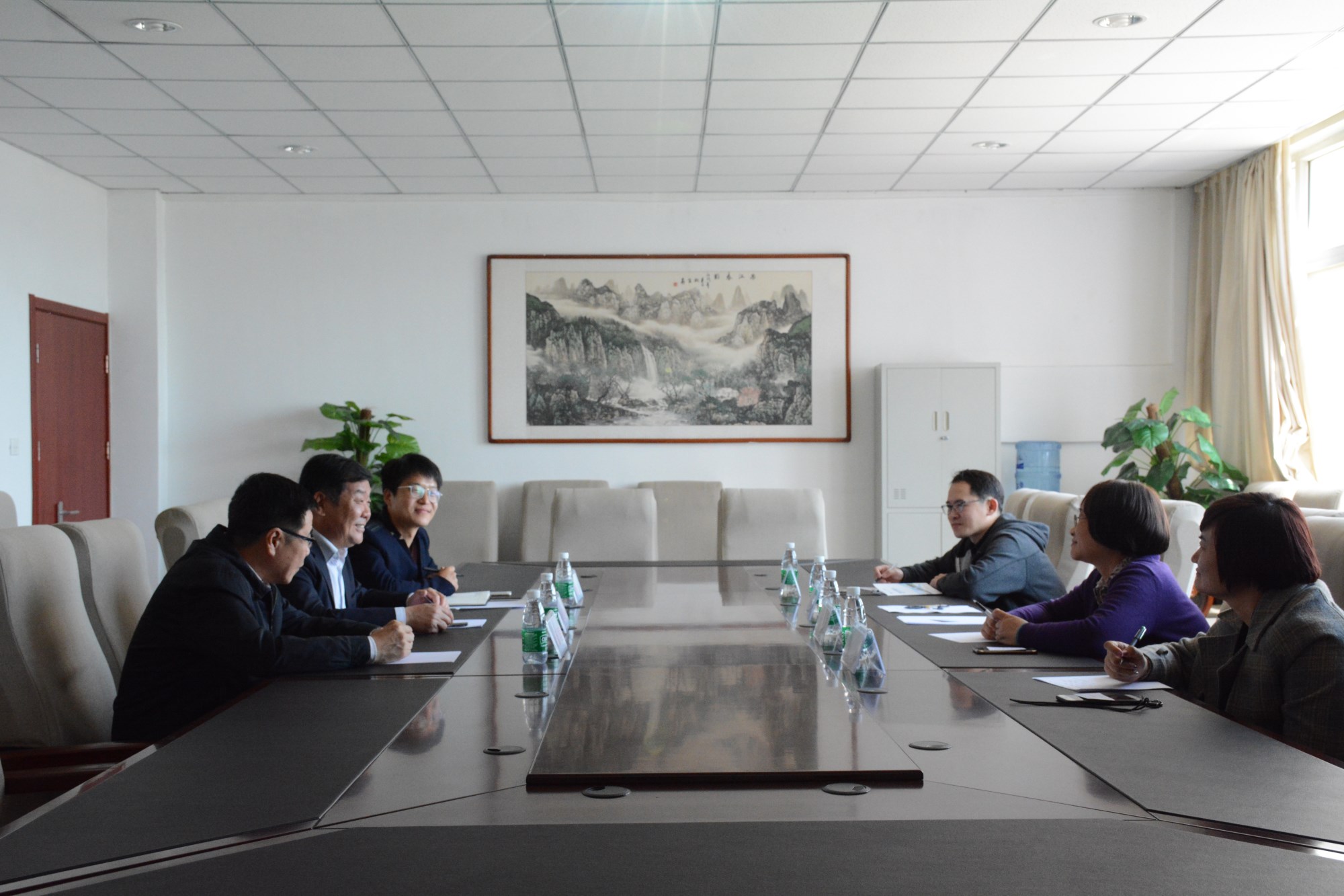 双选会前,院长王化深、副院长徐爱国、招生就业处处长邵晓康与中国科学院人才交流开发中心陈彬主任一行在会议室进行会谈,双方就2018届毕业生特点、毕业生就业意向及未来合作方向展开交流。