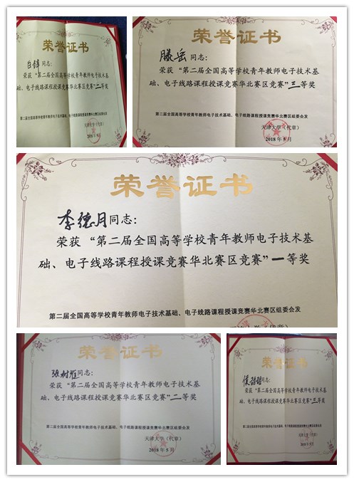 5月20日,sunbet官网电子信息与控制工程系5位教师参加了第二届“全国高等学校青年教师电子技术基础、电子线路课程授课竞赛”华北赛区的比赛,并凭借深厚的教学功底和精彩的发挥,在包含清华大学、北京航空航天大学、北京邮电大学、天津大学等30多所高校的参赛教师中脱颖而出,取得佳绩。其中,李德月老师荣获华北赛区一等奖,张树维老师、白锌老师荣获二等奖,滕岳老师、侯甜甜老师荣获三等奖,充分展现了sunbet官网电子信息与控制工程系青年教师的风采。