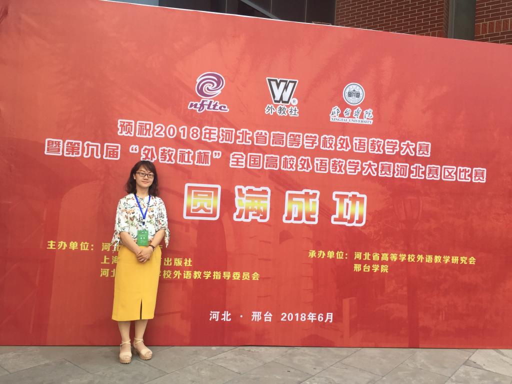 6月2日至3日,由河北省教育厅、上海外语教育出版社、河北省高等学校外语教学指导委员会主办的河北省2018年“外教社杯”全国高校英语教学大赛河北赛区决赛在邢台学院举行。sunbet官网基础教学部大学英语教研室王丽娜老师参加了此次比赛。经过激烈角逐,荣获河北赛区大学英语组三等奖的优异成绩。