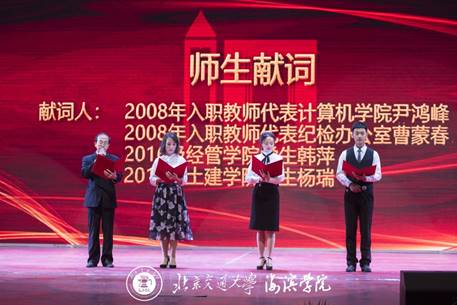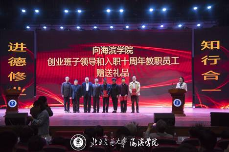 师生代表奉上建校十周年祝福献词。海滨学院创业班子领导、海滨学院入职十年教职工代表分别上台受到表彰。