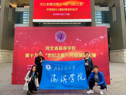 2018年11月17-18日,河北省高等学校第十九届“世纪之星”外语演讲大赛决赛在河北师范大学举行。sunbet官网外国语学院贾世娇和郭玉姿带领的参赛队伍参加了本次比赛。来自全省103所高校的411名选手参加了本次比赛。经过两天比赛的激烈角逐,层层选拔,最终sunbet官网胡景雯获青年教师组二等奖,王璐瑶获青年教师组三等奖;英语专业2016级学生林佳慧获英语专业组三等奖,电气工程及自动化专业2017级学生张昊文、财务管理专业2017级学生刘博获得非专业组三等奖。