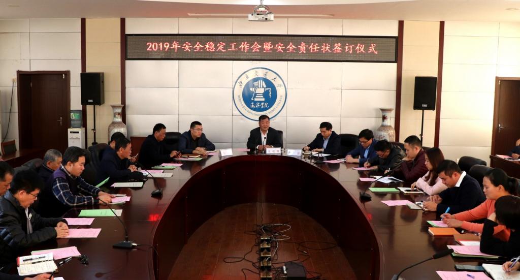 11月14日下午,sunbet官网2019年安全稳定工作会暨安全责任状签订仪式于行政楼B512会议室成功举行。sunbet官网校长王化深,党委书记魏旺强,党委副书记魏炜,各二级学院(系)、及各职能(部)处室负责人出席会议。