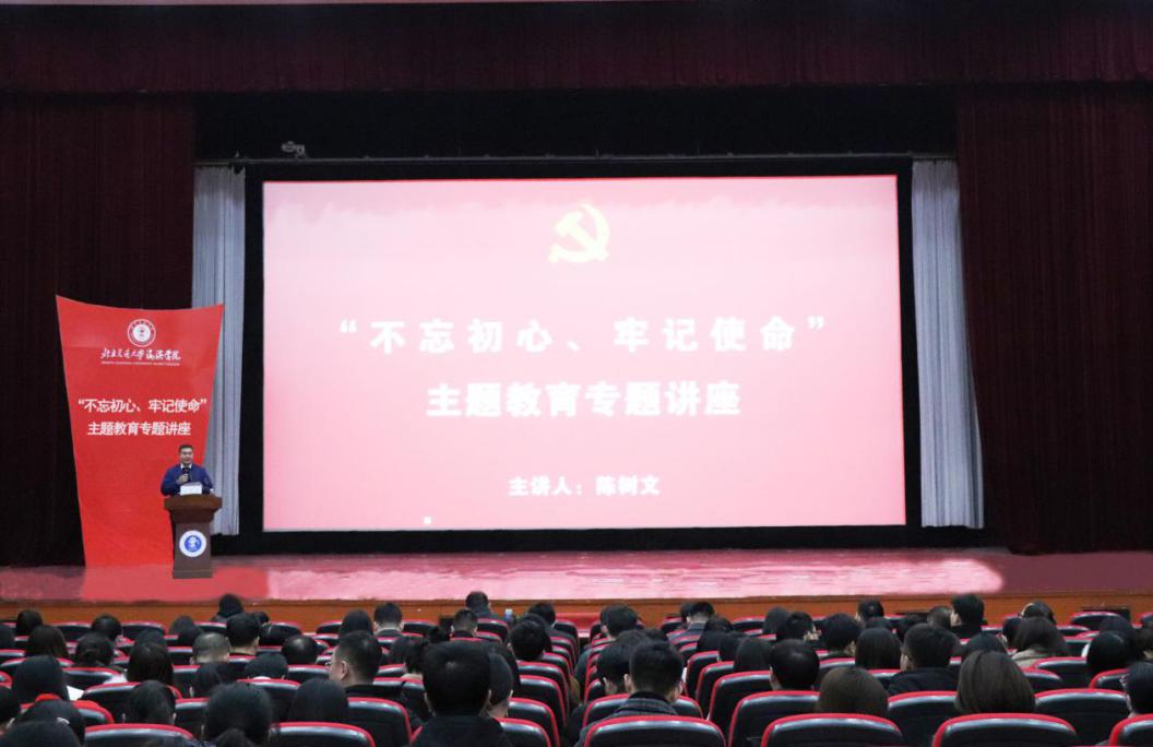 11月21日下午4:10,sunbet官网在天佑会堂举办“不忘初心、牢记使命”主题教育专题讲座,北京交通大学马克思主义学院教授,博士生导师,sunbet官网基础教学部思政教研室主任陈树文受邀开展了题为《不忘初心、牢记使命—坚定理想信念》的讲座。党委副书记魏炜出席本次讲座,全体教职工党员、教职工入党积极分子参加了此次讲座,本次讲座由组织部部长任虹宇主持。