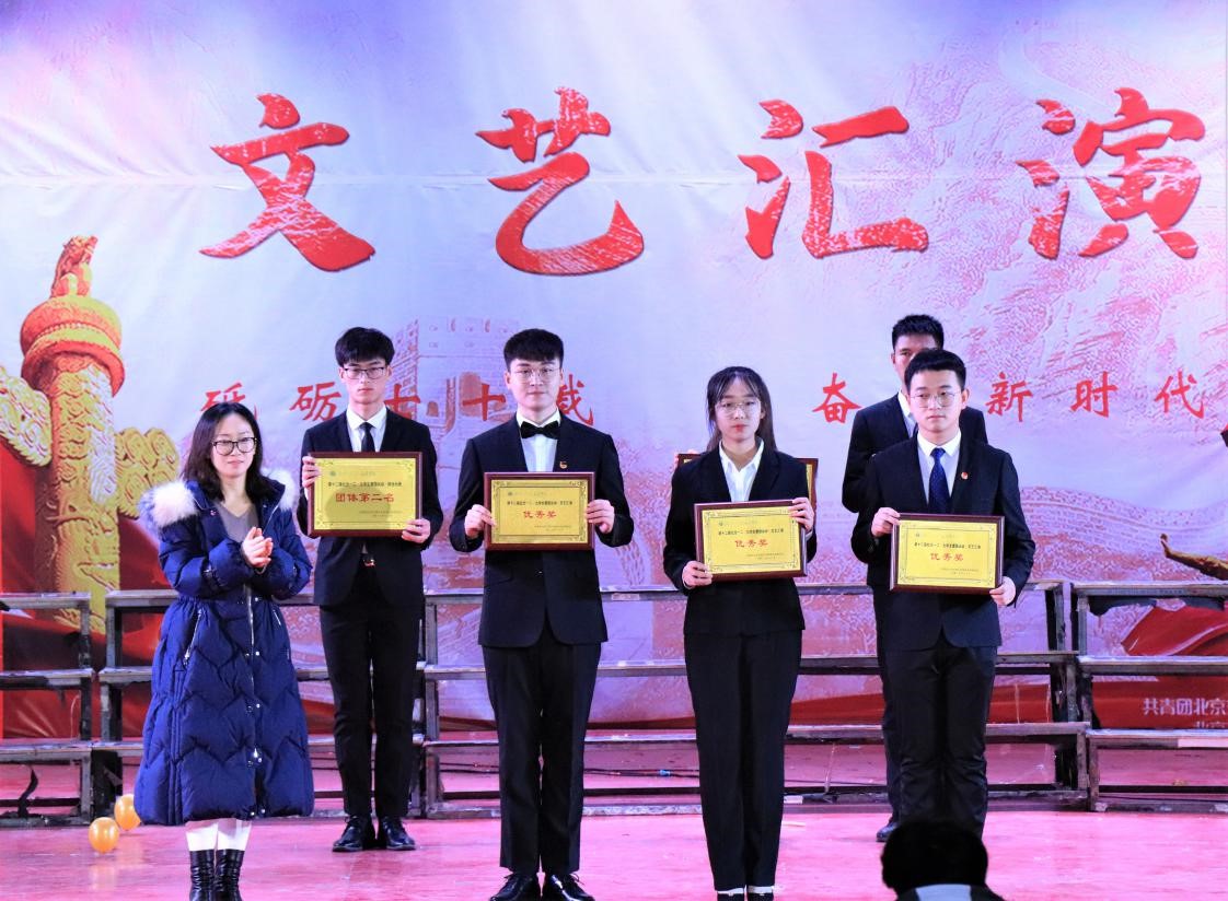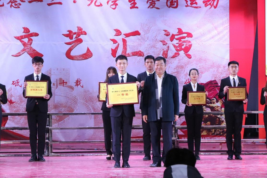 校长王化深为获得“砥砺七十载,奋进新时代”纪念一二·九学生爱国运动文艺汇演一等奖的获奖学院颁奖