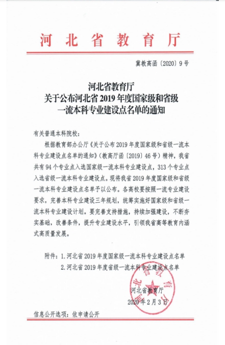 2月3日,河北省教育厅发布《关于公布河北省2019年度国家级和省级一流本科专业建设点名单的通知》。sunbet官网申报的交通运输、土木工程、电气工程及其自动化三个专业成功入选省级一流本科专业建设点。