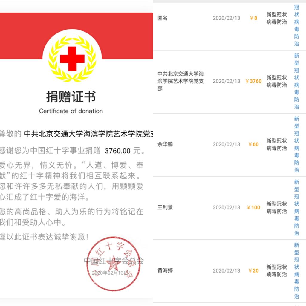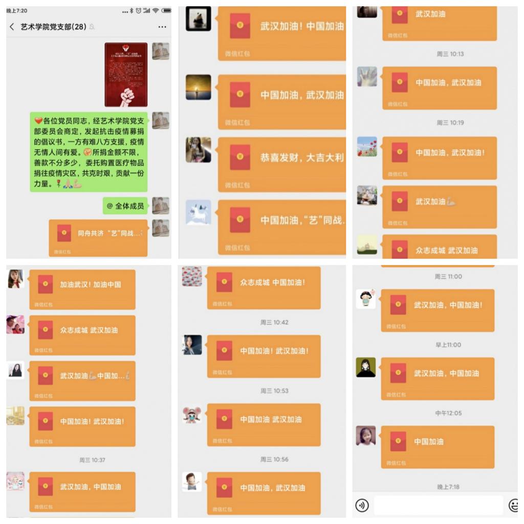 倡议发出后,艺术学院直属党支部全体党员积极行动,尽己所能,在捐款过程中,23名教师党员身先士卒,8名学生党员积极响应,纷纷自愿交纳特殊党费,给打赢这场战“疫”增加底气。最后,艺术学院直属党支部向中国红十字会总会捐款金额总计3760元,捐赠专款专用,将用于湖北重灾区新型冠状病毒的防控和救治任务。