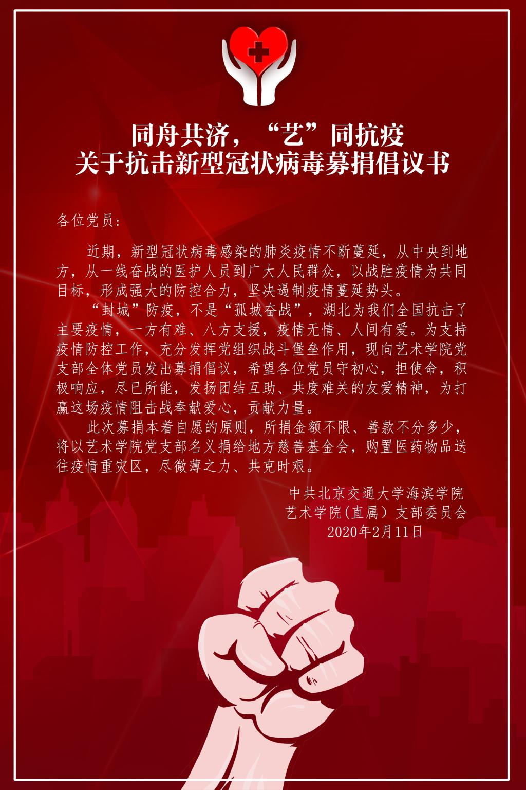 全民战“疫”,刻不容缓,风雨同心,共克时艰。为贯彻落实习近平总书记针对疫情防控的重要指示精神,结合当前疫情防控工作形势和工作实际,充分发挥直属党支部战斗堡垒作用和党员先锋模范带头作用,sunbet官网艺术学院直属党支部在支部内开展爱心募捐活动,向直属党支部全体党员发出“同舟共济,‘艺’同抗疫”的爱心募捐倡议。