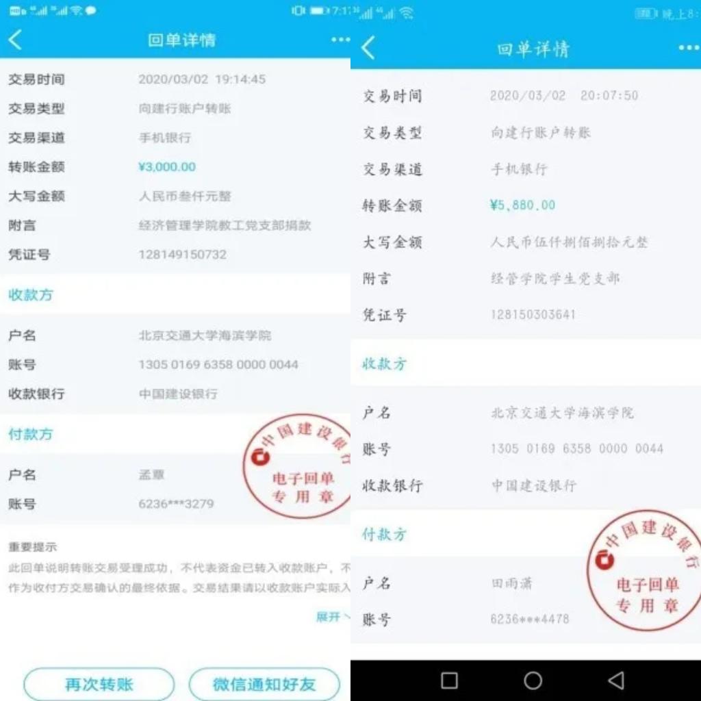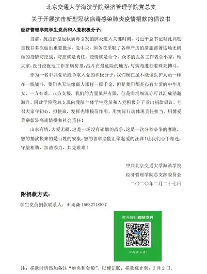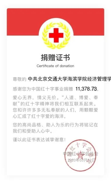 捐款倡议发出后,师生党员和积极分子积极响应,踊跃捐款、奉献爱心,积极支持新冠肺炎疫情防控工作,为坚决打赢疫情防控阻击战积极贡献力量。经济管理学院全院32名教师党员共计捐款3000元,65名学生党员共计捐款5880元,师生党员全部善款已统一上交校党委组织部。另外,全院284名入党积极分子也倾情相助,共计捐款11378.73元,以“中共北京交通大学海滨学院经济管理学院总支部委员会”的名义,专项捐献给中国红十字会抗击疫情使用。