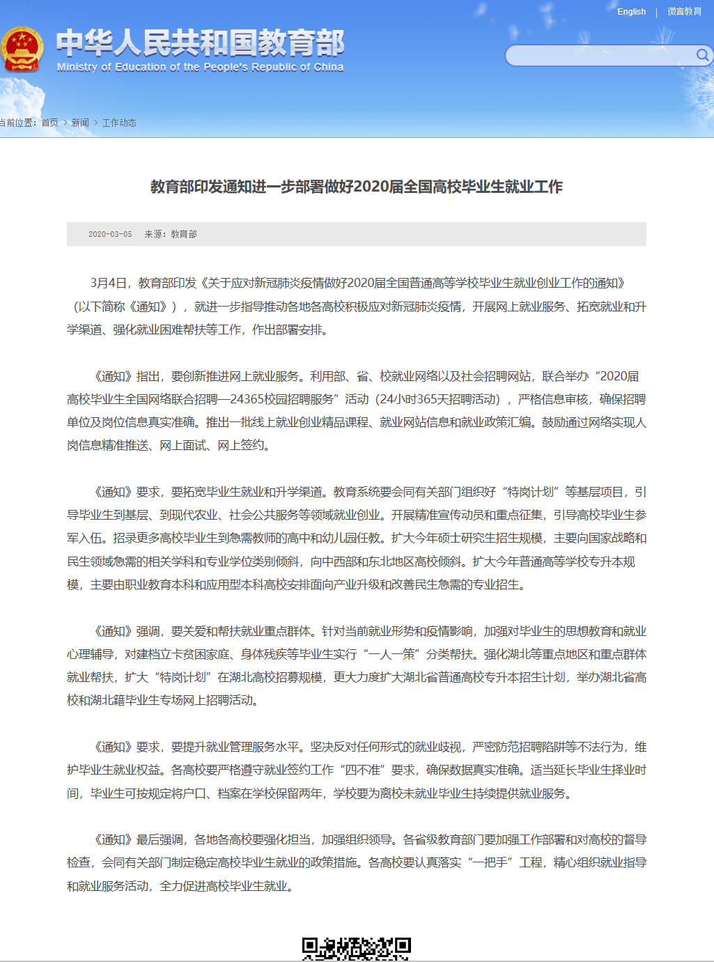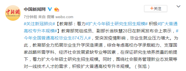 3月4日,教育部印发通知要求,扩大今年硕士研究生招生规模,主要向国家战略和民生领域急需的相关学科和专业学位类别倾斜,向中西部和东北地区高校倾斜。扩大今年普通高等学校专升本规模,主要由职业教育本科和应用型本科高校安排面向产业升级和改善民生急需的专业招生。