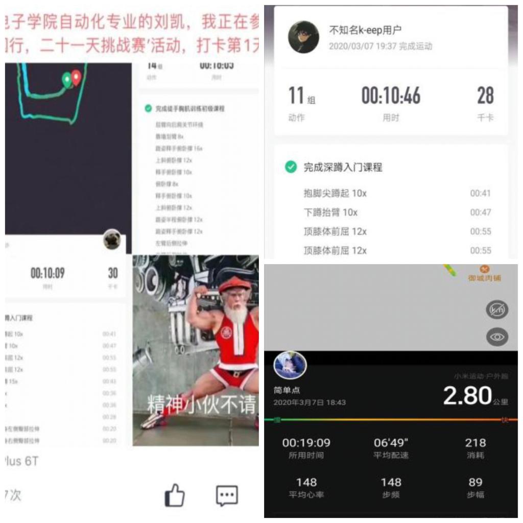 疫情来袭,sunbet官网电子与电气工程学院积极响应sunbet官网开展的“不停学不停练—每日健康打卡”活动,特此举办线上二十一天成果展示活动,得到了同学们的积极响应,纷纷借助各种健身软件完成每日的锻炼,通过app为自己安排合适的的健身活动与健身计划。