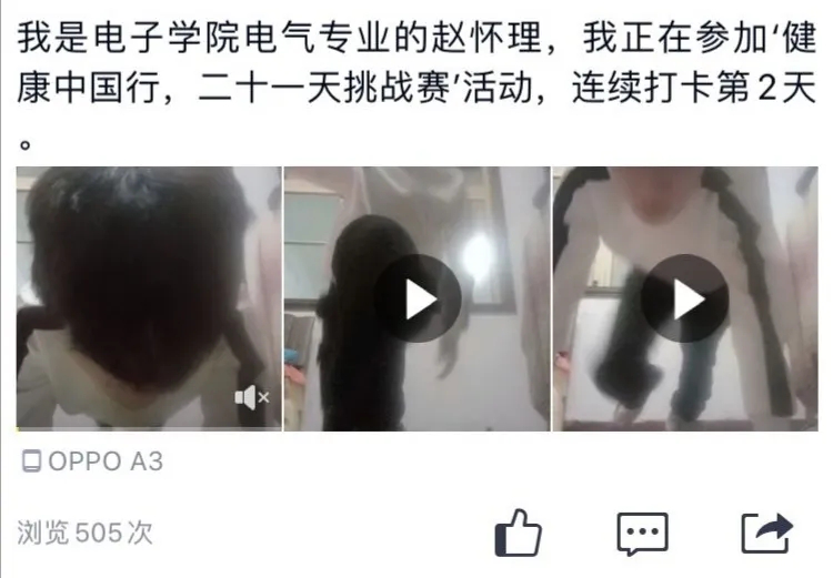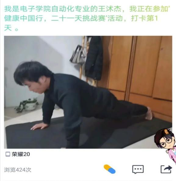 居家锻炼活动范围受限、健身器材的缺失,促使很多电子学院的学生选择以俯卧撑的形式参加本次挑战。他们纷纷在QQ空间打卡,并表示居家锻炼不仅强身健体,而且还会使心情更加舒畅。
