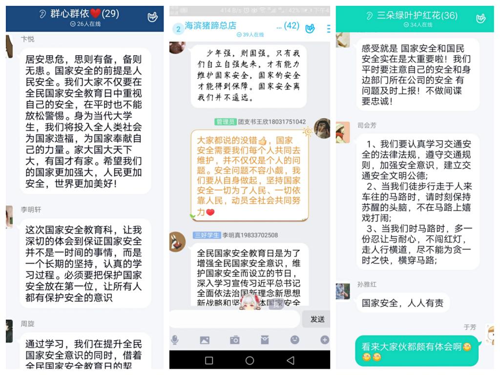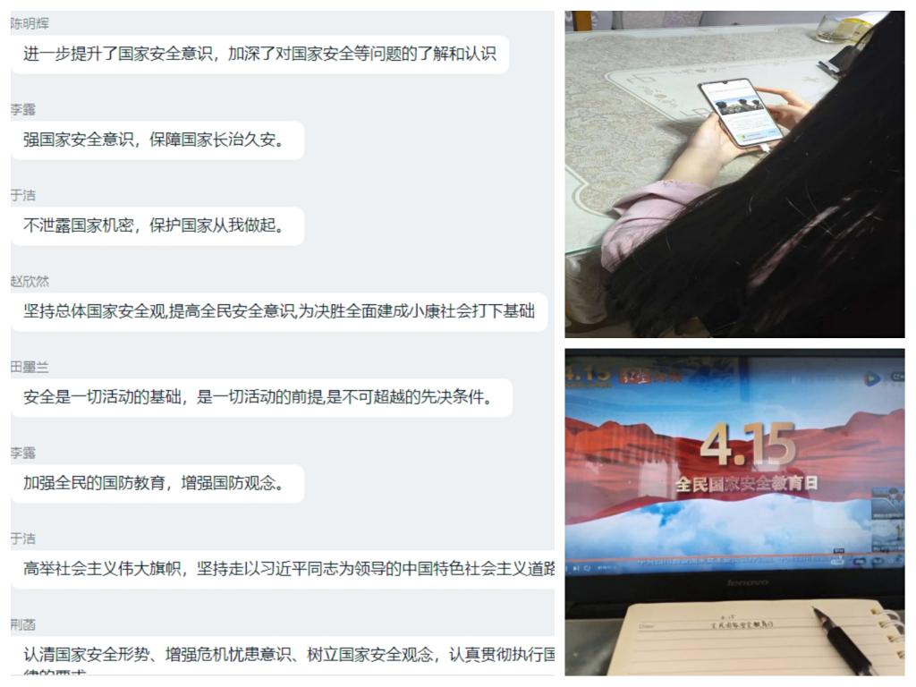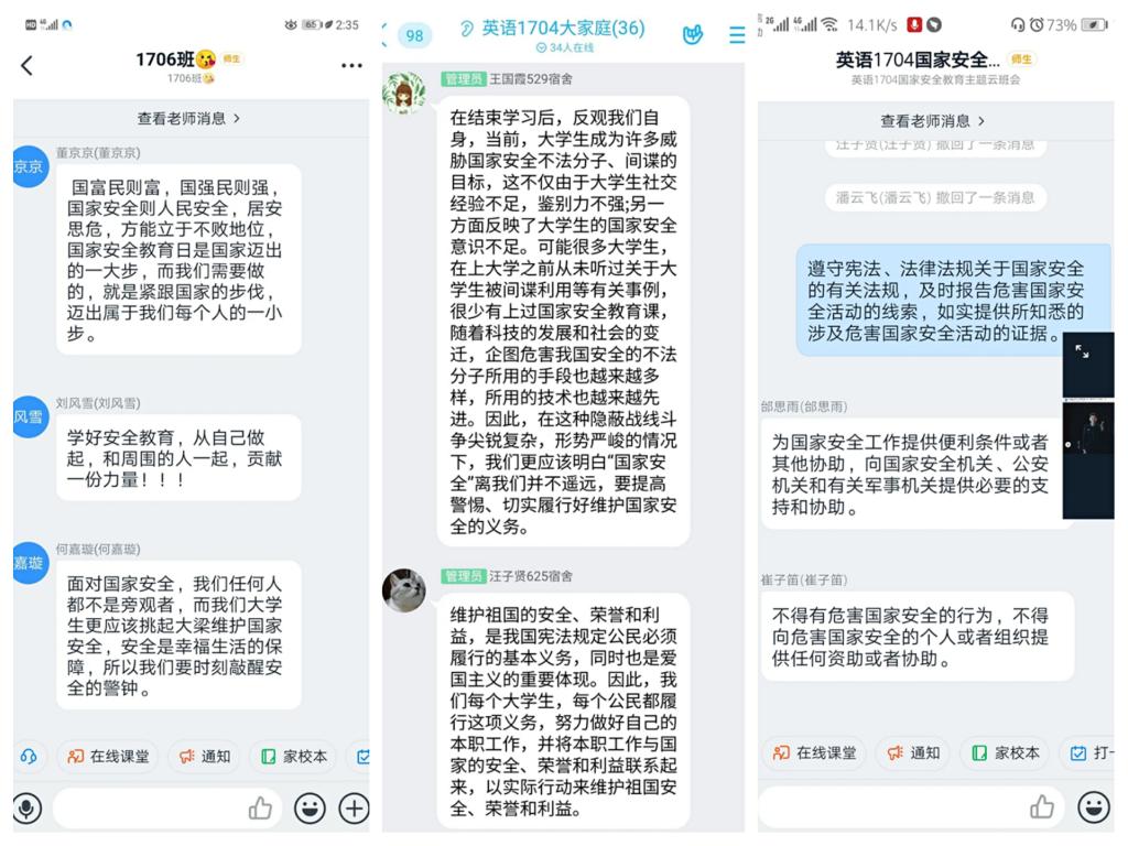 本次主题班会以收看全国公开课《千万学生同上一堂国家安全教育课——总体国家安全观视角下的疫情防控》为主要内容,外国语学院学生们热情高涨、认真学习,纷纷在笔记本上记录重要知识点,通过“云班会”,“群组讨论”等不同形式对国家安全相关话题进行了交流讨论。