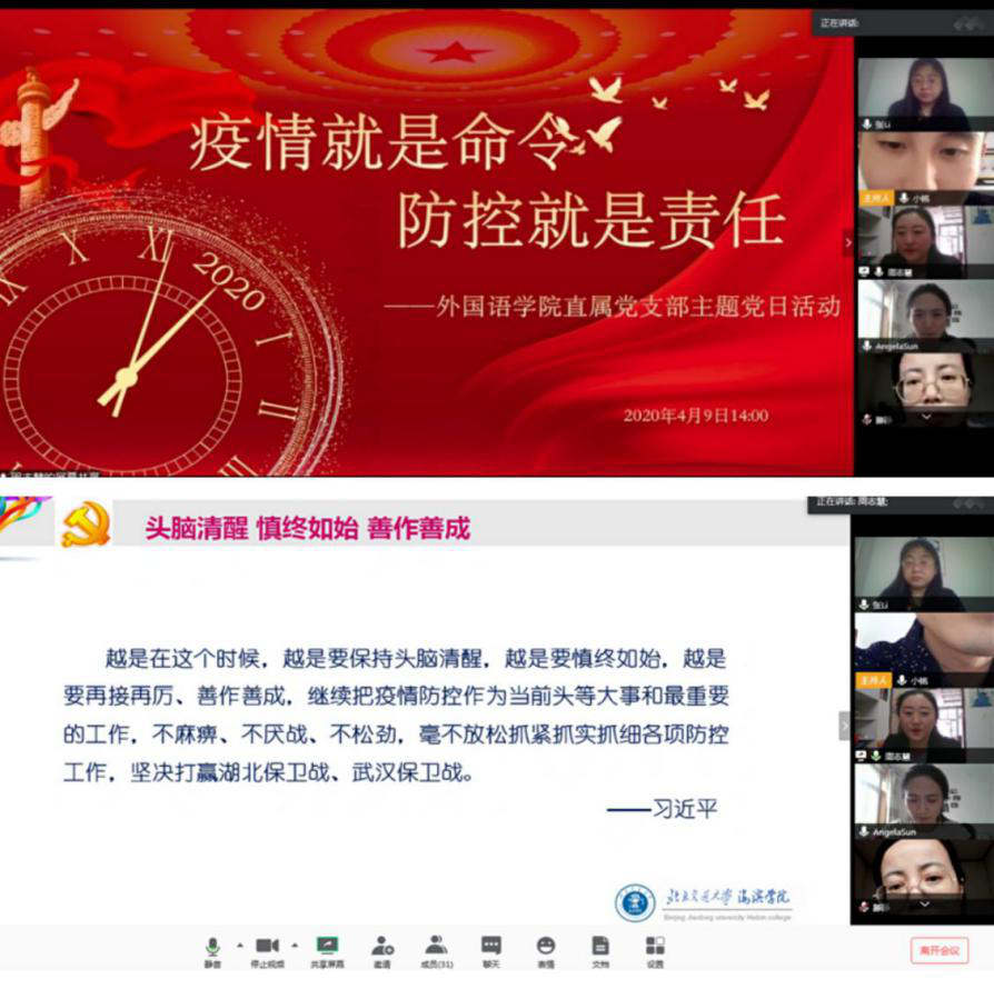新冠肺炎疫情突发以来,sunbet官网坚决贯彻落实中共中央政治局常务委员会会议精神,积极响应、充分部署,广大师生党员带头行动参与群防群控,以云端视频会议的方式召开主题党日活动,围绕学校当前重点任务和阶段性重点工作,把打赢疫情防控阻击战作为实际行动。