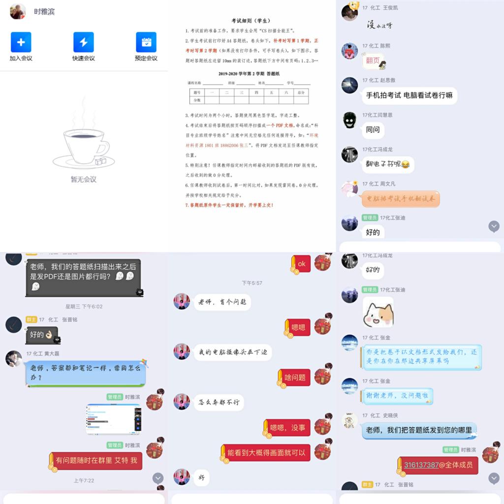 面对新形式的考试,为了让同学们熟悉网络考试流程,确保考试顺利进行,时雅滨跟学生们进行了一场考试预演:1、针对线上考试可能会出现的各种问题,与同学们一起讨论研究,耐心为每一位学生调整摄像头的角度,让学生们呈现出最好的精神面貌,也为考试提供公平公正的环境。2、与学生共同学习“CS扫描全能王”软件,为答题卡扫描上传做准备。3、针对化工系制作的答题纸模板进行讲解,规范学生电子答卷的命名格式及答卷提交形式,明确答卷提交时间,叮嘱学生保留答题纸原件,等待开学后上交。