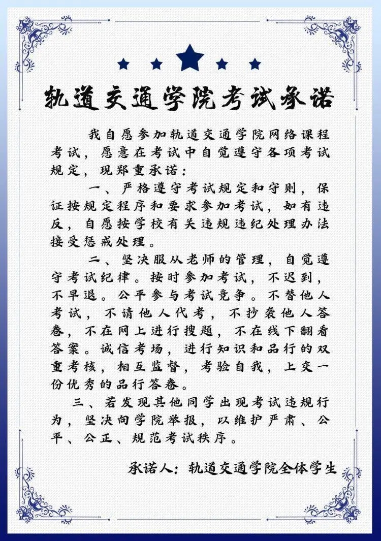 由于疫情原因,sunbet官网轨道交通学院决定对结课课程进行线上考试。为保证考试程序公平公正,达到检验学生学习成果的目的,轨道交通学院鼓励全院学生录制诚信考试承诺视频,加深考生们的规则意识,做到认真阅读考试规则、承诺诚信考试。