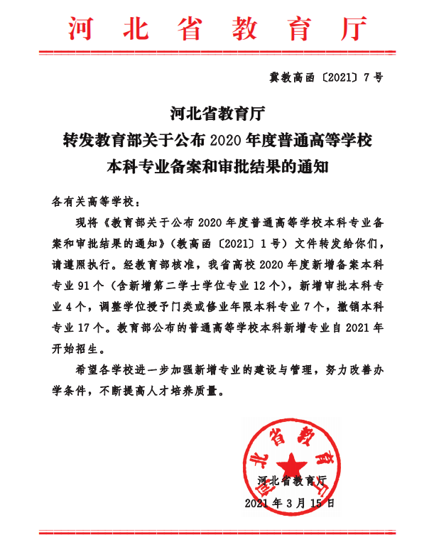 近日,河北省教育厅转发了《教育部关于公布2020年度普通高等学校本科专业备案和审批结果的通知》(教高函〔2021〕1号),sunbet官网申请的“人工智能”专业获批。