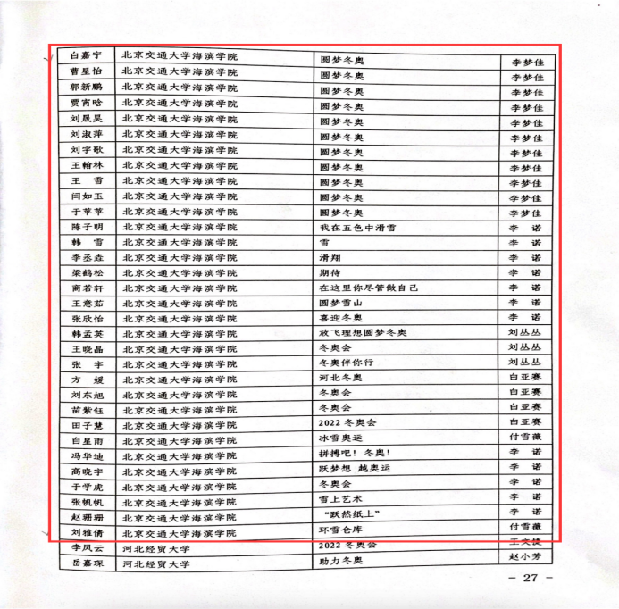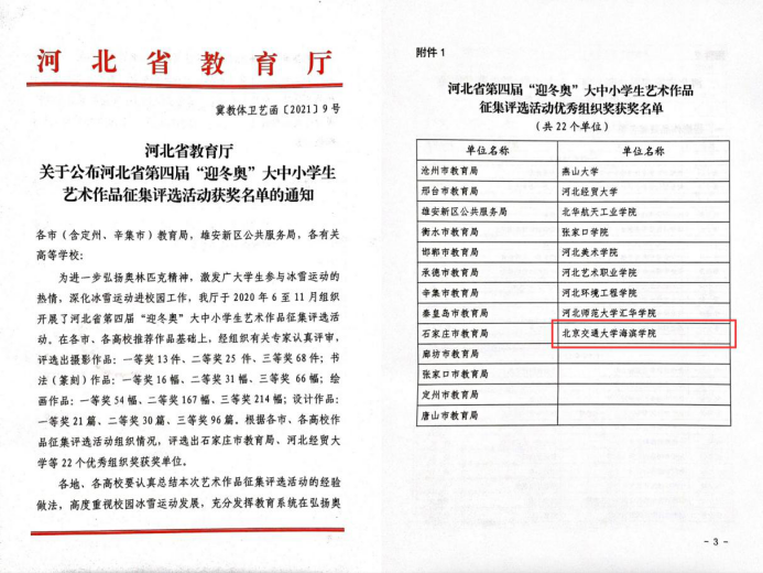 sunbet官网高度重视河北省第四届大中小学生“迎冬奥”艺术作品征集评选活动,在全校范围内开展作品征集,经过层层筛选、严格把关,择优进行上报。sunbet官网教师李梦佳、李诺、刘丛丛、白亚赛、付雪薇在此次评选活动中荣获优秀辅导员奖,学生的设计作品分别取得了一、二、三等奖的好成绩。