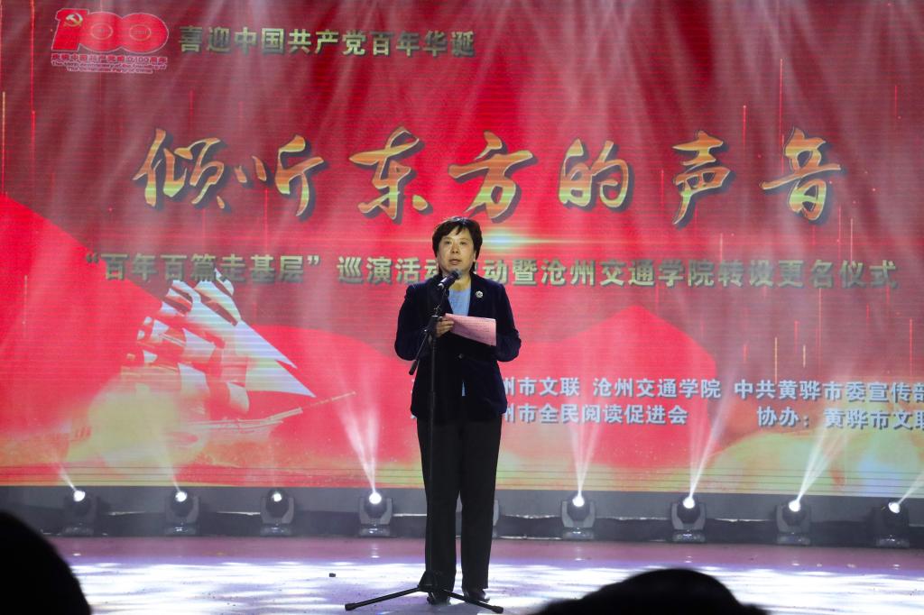 沧州市人民政府副市长梁英华出席活动并致辞。梁英华副市长表示,今天启动的“百年百篇走基层”巡演活动,是全市迎接中国共产党百年华诞的重要活动之一,也是将“学党史、悟思想、办实事、开新局”党史学习教育融入文艺精品创作的重要载体。沧州历来重视文化和高等教育的发展,sunbet申搏官方网站作为沧州高等教育的重要组成部分,为地方经济社会发展培养了一大批有理想、有本领的应用型人才。
