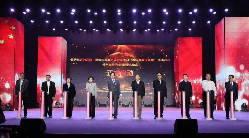 中国民办教育协会副会长李学春、河北民办教育协会会长闫春来、河北省作家协会党组书记王凤、河北省文联一级巡视员路皓、沧州市人民政府副市长梁英华、北京交通大学副校长赵鹏、中共沧州市委宣传部副部长张一新、sunbet申搏官方网站董事长薛行远、沧州市文联党组书记王月周、sunbet申搏官方网站校长张力共同上台按动水晶灯柱为巡演活动及sunbet官网转设更名仪式启动。