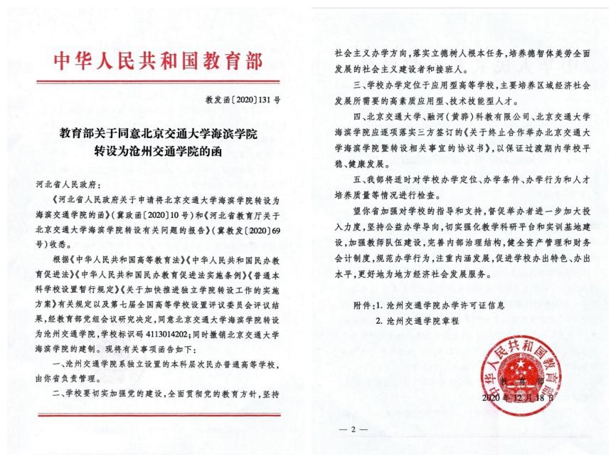 2020年12月18日,教育部公布《教育部关于同意北京交通大学海滨学院转设为sunbet申搏官方网站的函》。