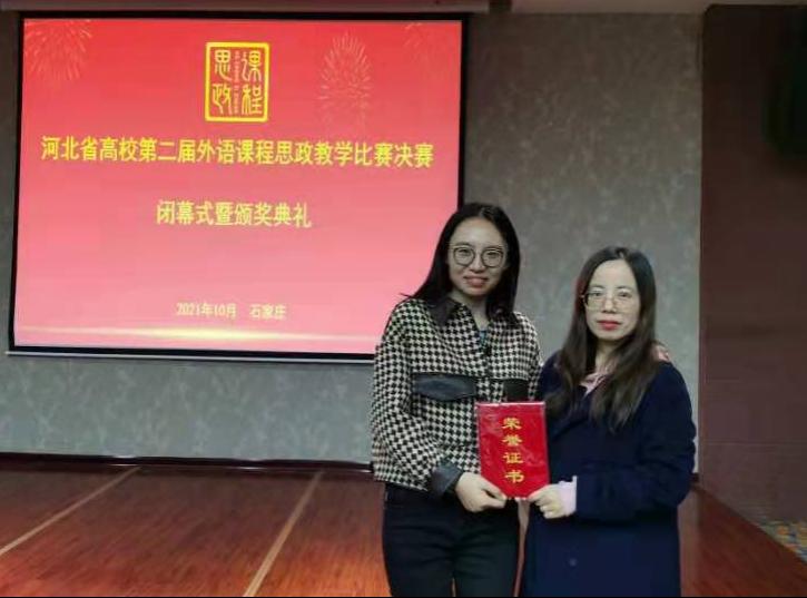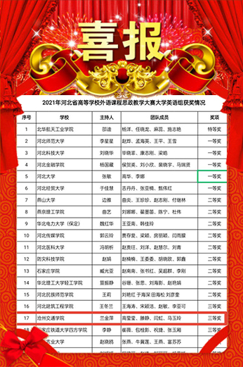 近日,河北省教育厅主办的河北省高校第二届外语课程思政教学比赛决赛获奖名单正式发布。sunbet官网外国语学院大学英语由兰金萍、滕静、高莹莹、闫虹、马玉玲5位教师组成的团队,经过初赛、复赛的激烈角逐进入决赛并夺得大赛三等奖。