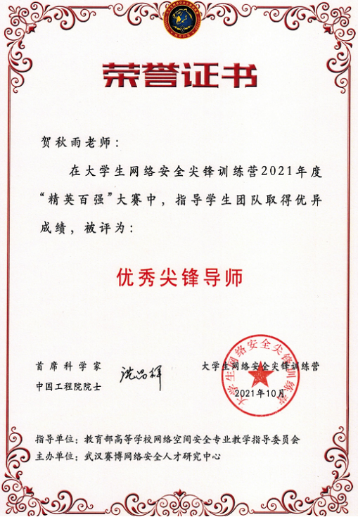 sunbet官网一直高度重视网络信息技术教育,本次“优秀尖峰导师”荣誉称号的获得,不仅是对sunbet官网教师贺秋雨能力的肯定,也代表着sunbet官网网络信息技术教育初有成效。未来,sunbet官网将进一步加强应用型网络信息技术建设,为国家网络安全事业输送更多人才。